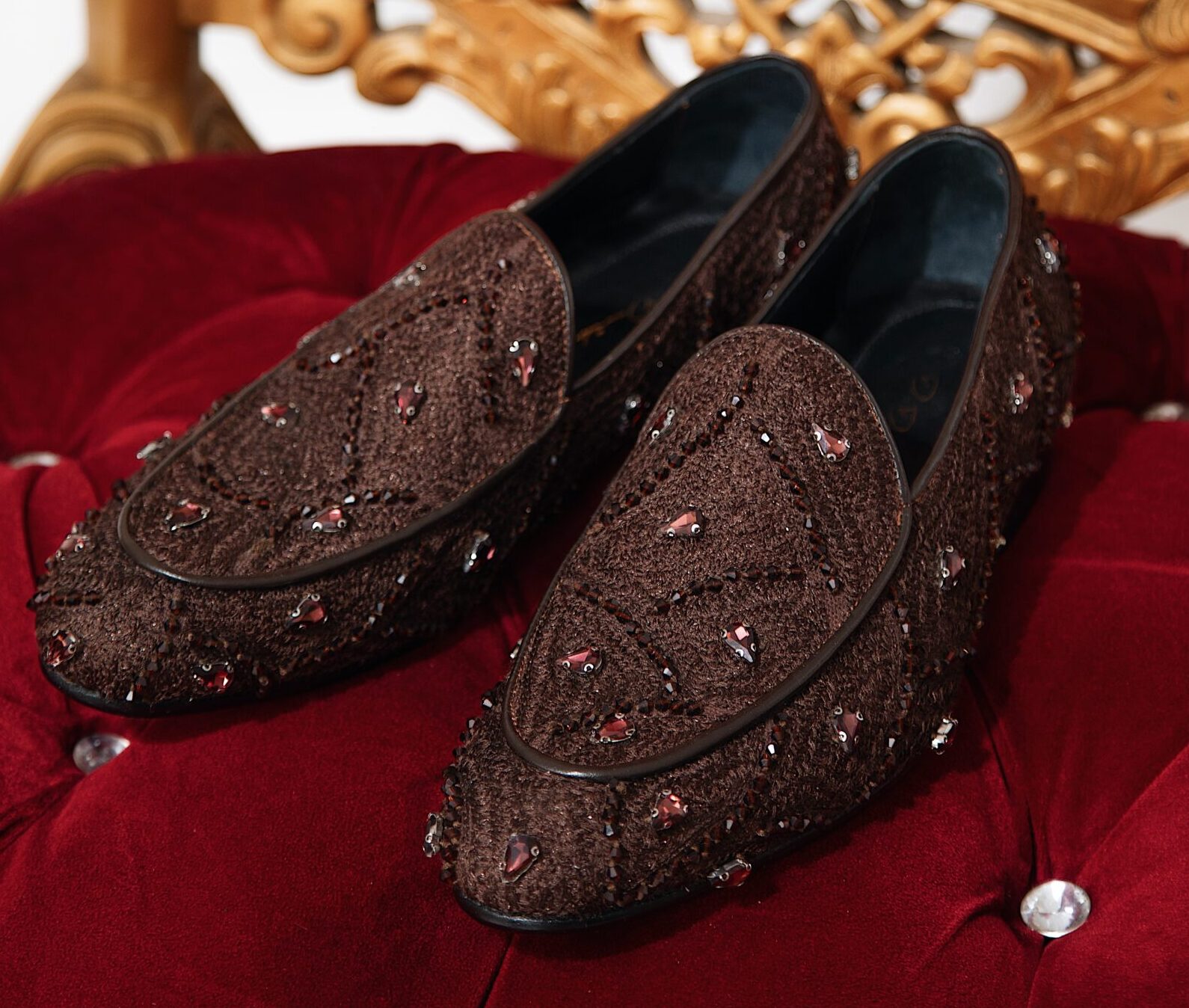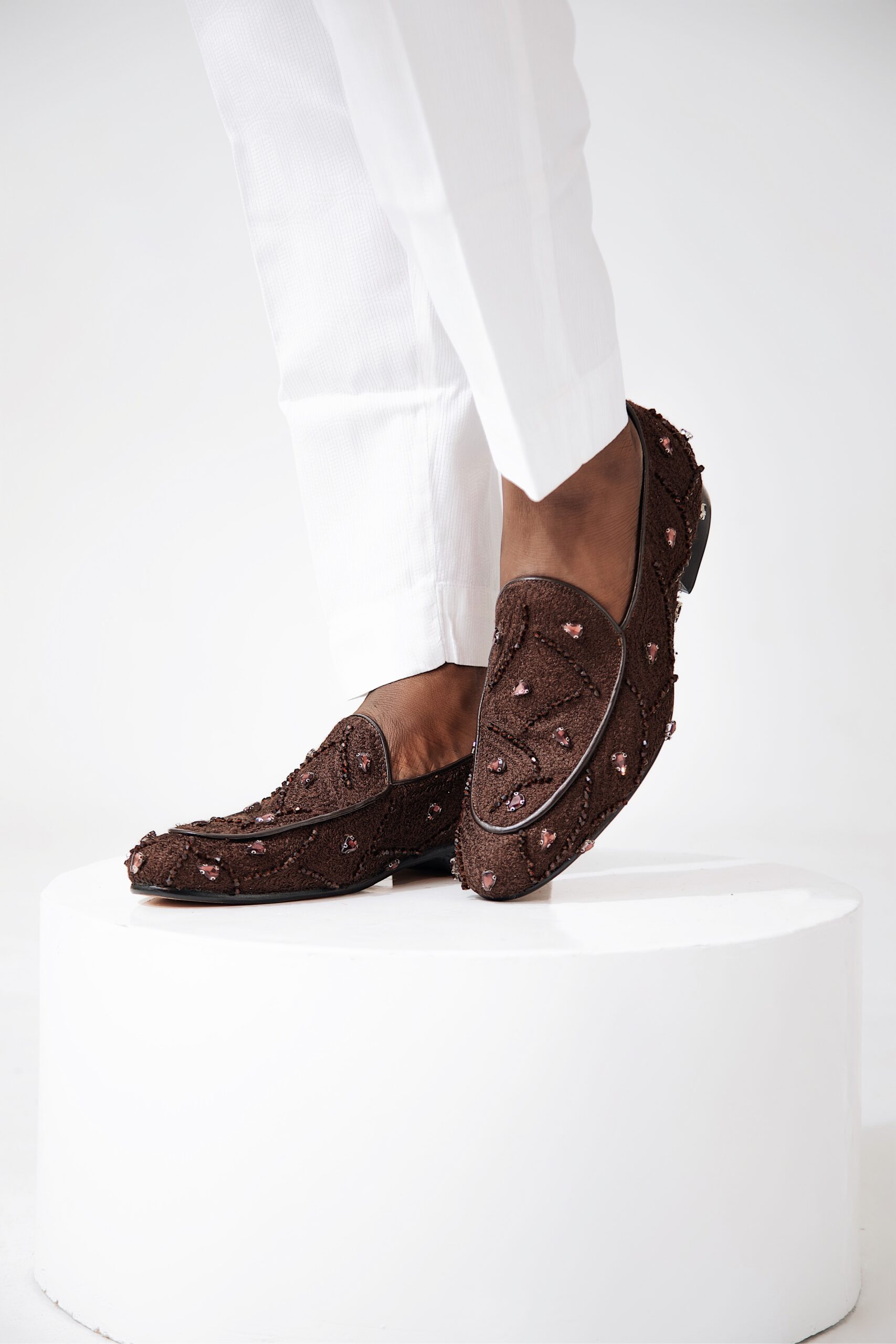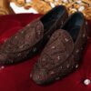 Handcrafted wedding loafers made from premium Aso-Oke fabric, finished with subtle embellishments and Red-bottom sole. A refined choice for the modern groom.